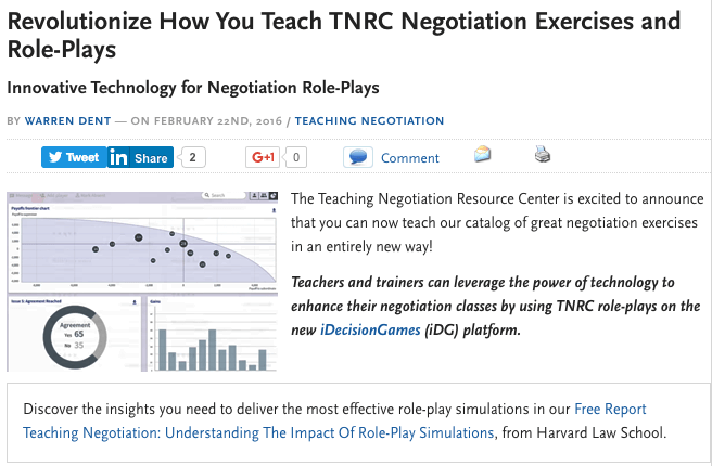 iDG Services worked closely with the Teaching Negotiation Resource Center at Harvard to make their cases interactive. Now Teachers and trainers can leverage the power of technology to enhance their negotiation classes by using TNRC role-plays on the new iDecisionGames (iDG) platform.
